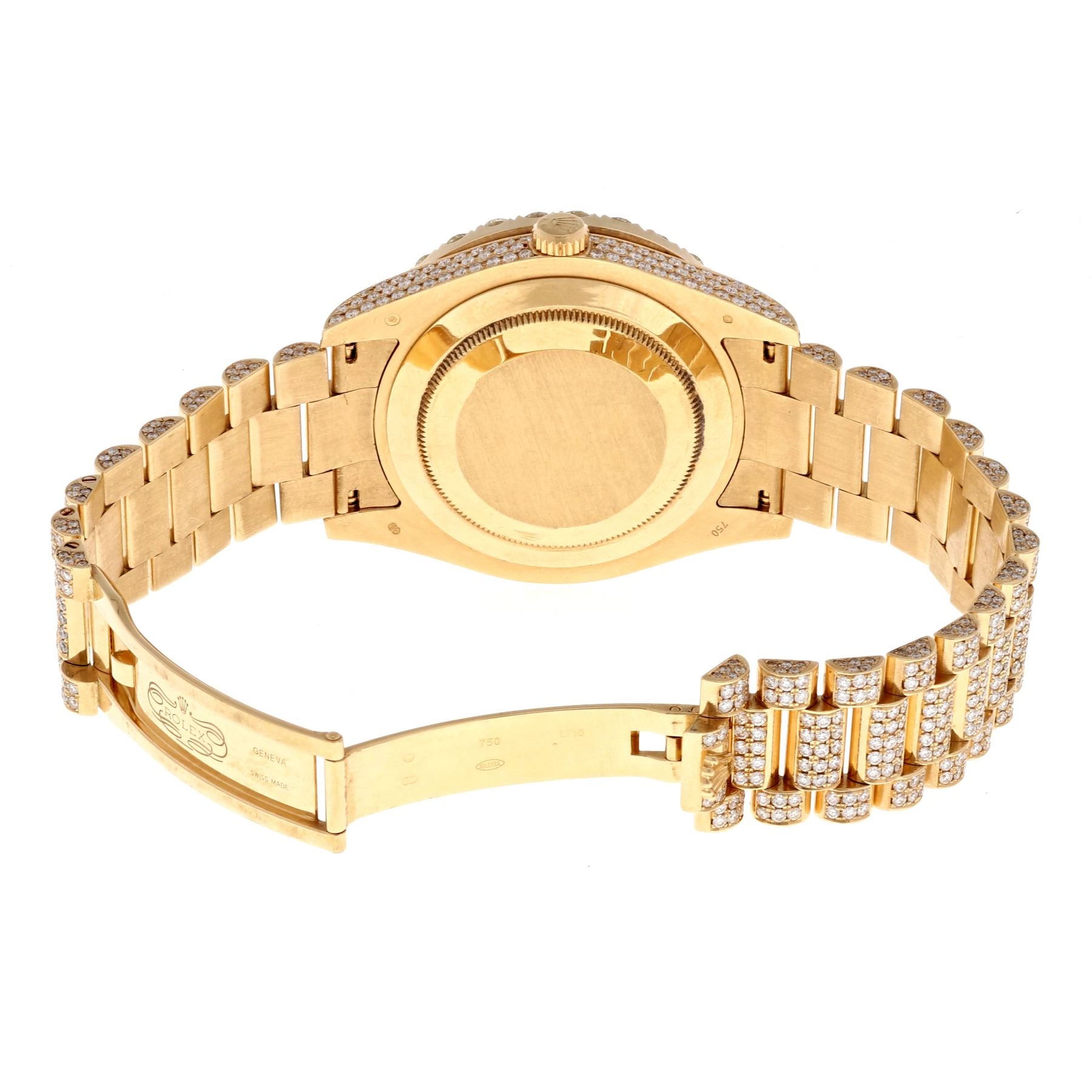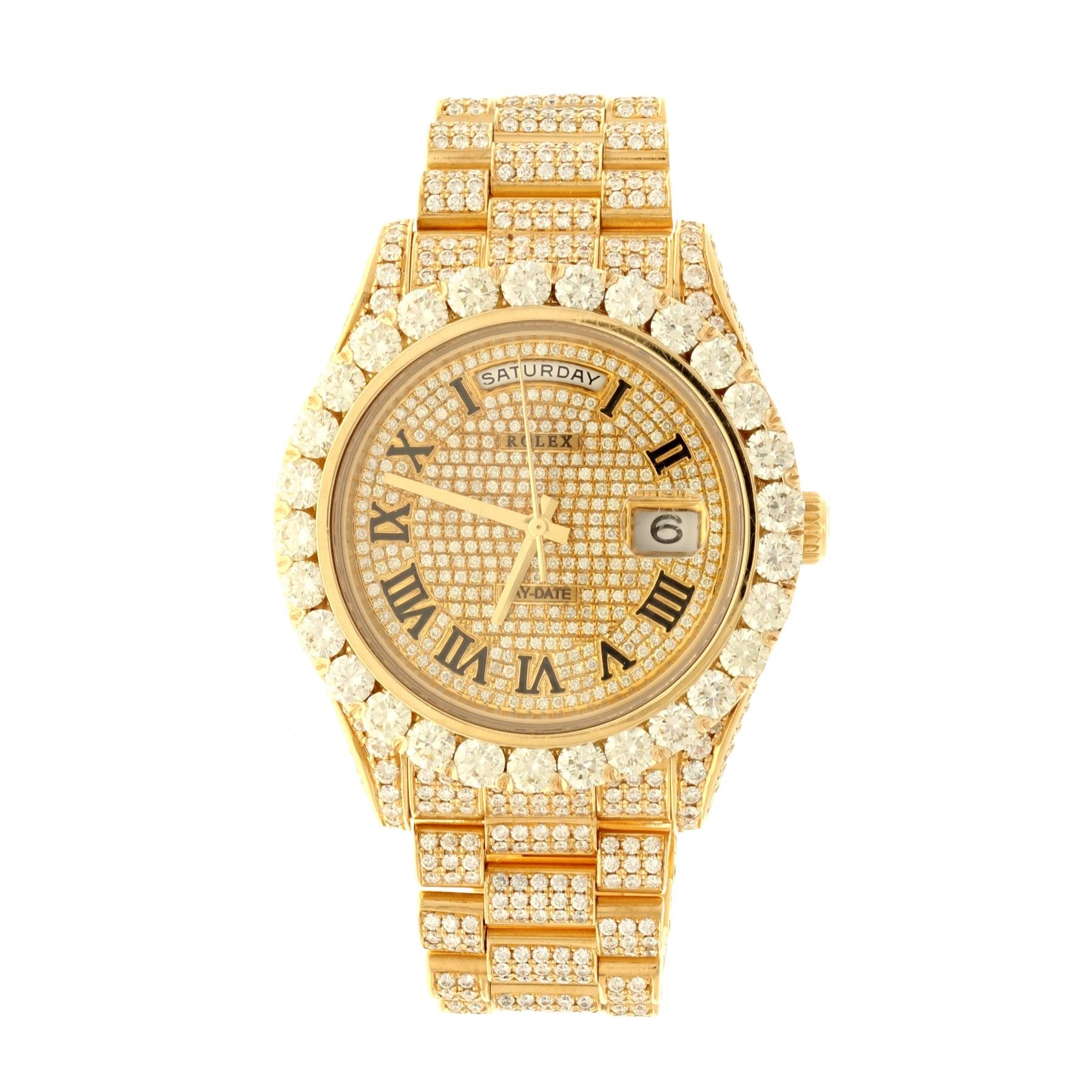 ROLEX: [1] 18ky Rolex President watch with aftermarket diamonds; diamond dial, diamond bezel, Jubilee bracelet; Model 218238; Serial Number V588270; Movement 3 2939473 (3156); approx. (1232) round brilliant cut diamonds, 0.9mm-4.1mm equals an estimated 20.50 total carat weight, Very Good/H-I/VS1-VS2; 189.6 grams.