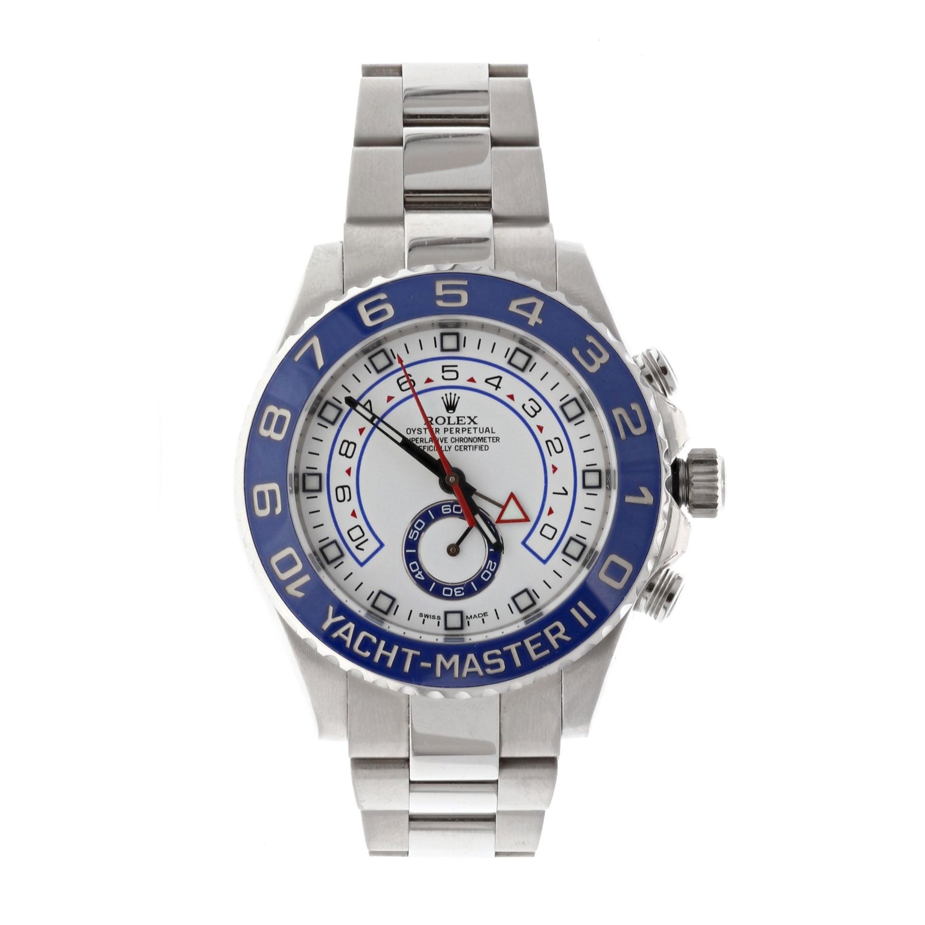 ROLEX: [1] Stainless steel Rolex Yachtmaster II 100M watch; 44mm case, white dial with 2 sub dials, blue bi-directional rotating bezel, oyster bracelet; Model 116680; Serial Number 555U3472; Movement 6941A400 (4161) 42 jewels.