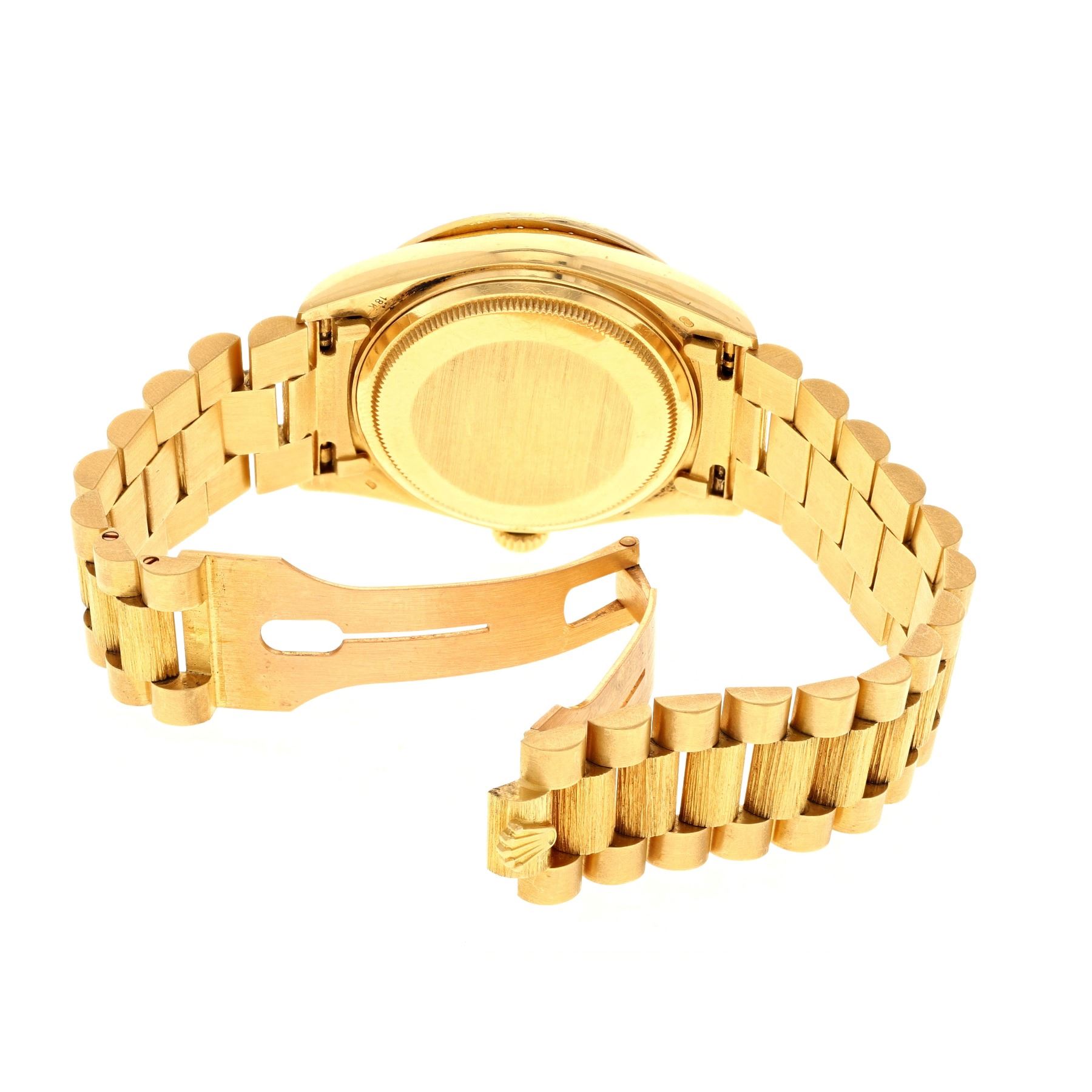 ROLEX: 18ky Rolex Oyster Perpetual DayDate President watch, 36mm case, gold dial with roman numerals, diamond bezel, president bracelet with bark finish; (44) rb diamonds, 2.0mm =est. 1.35cttw, V.Good/G-H/VS1-VS2; Model 18078; Serial Number R220820; Movement 1559586 27 jewel (3055); 142.6 grams.