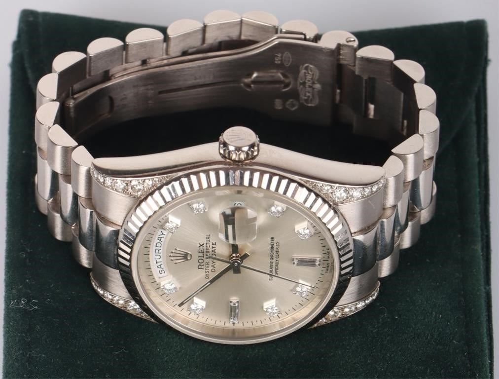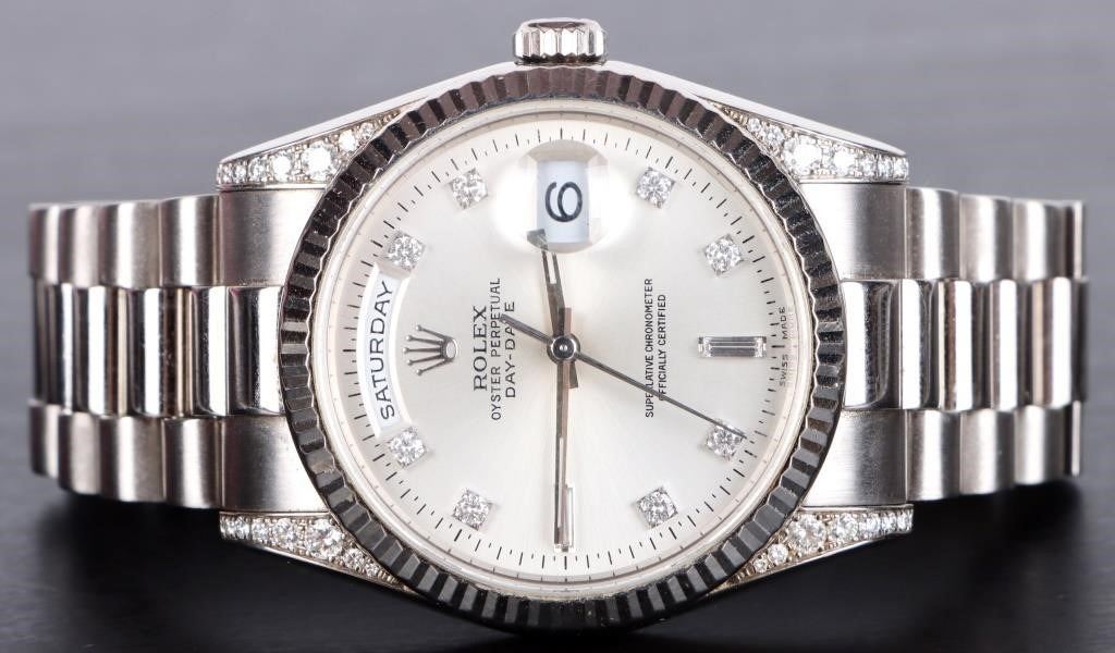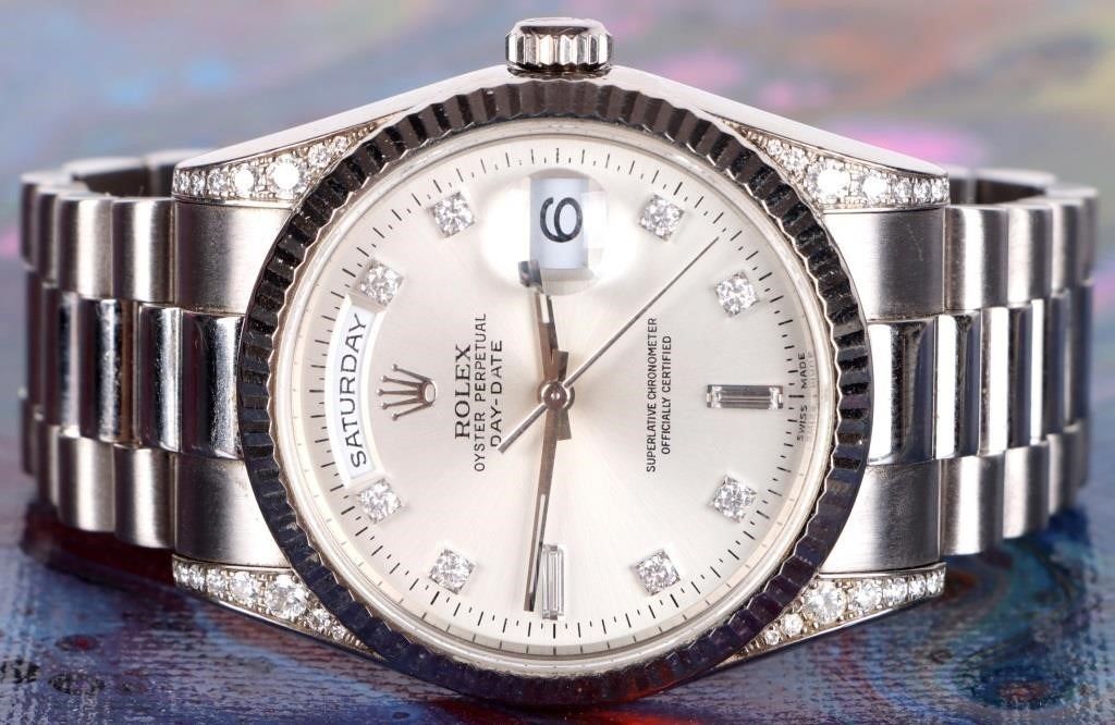 Rolex day-date 36 solid 18K white gold & diamonds ladies watch. Silver dial set with diamonds.10 diamonds set on dial. 32 diamonds set on case. Solid 18K white gold fluted bezel. Day and date features