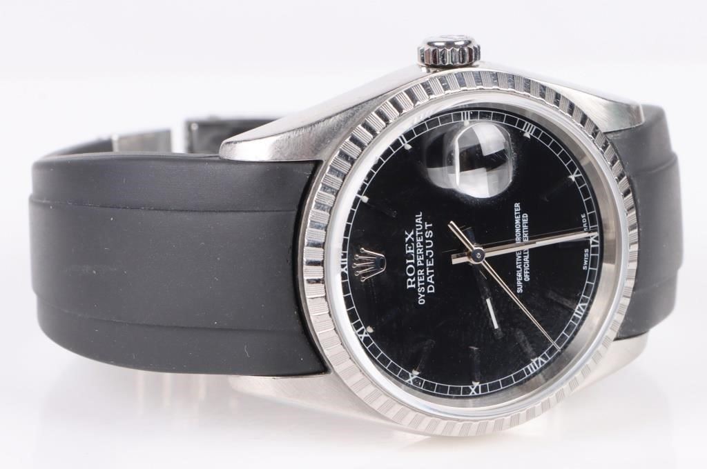 Rolex Men's Datejust 16220 black dial engine turned bezel stainless steel wristwatch to include original papers, a sapphire crystal, black dial, a rubber rolex band, and the original stainless steel band. Serial Number is certified.