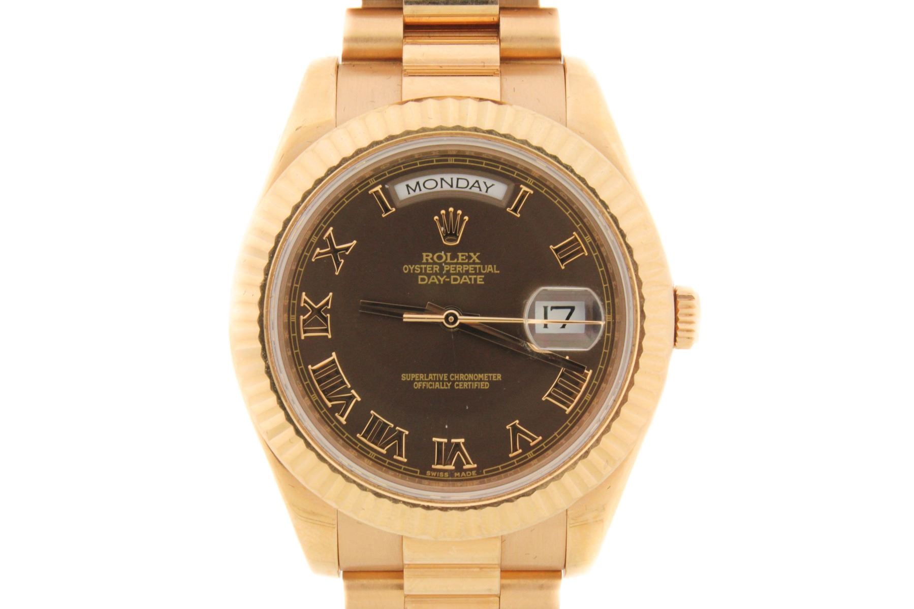 ROLEX: Men's 18kr Rolex Oyster Perpetual Day Date President watch; Model 218235; Serial UOX43614; MVMT 3 4970553 3156; Bracelet 83215; 207.6 grams.