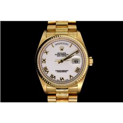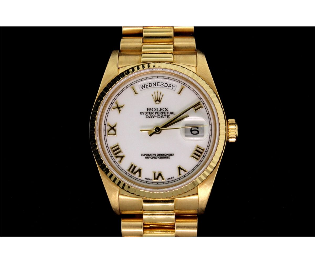 ROLEX: Men's 18ky Rolex O.P. Day Date wristwatch; white dial w/ gold Romans; fluted bezel, syn saph crystal; President link bracelet (8385), 1 rem link; Model 18038; Mvmt 1378064 (3055); Serial 8875097 (1985). Note: First serial 8 (factory) engraved "8" over "2".