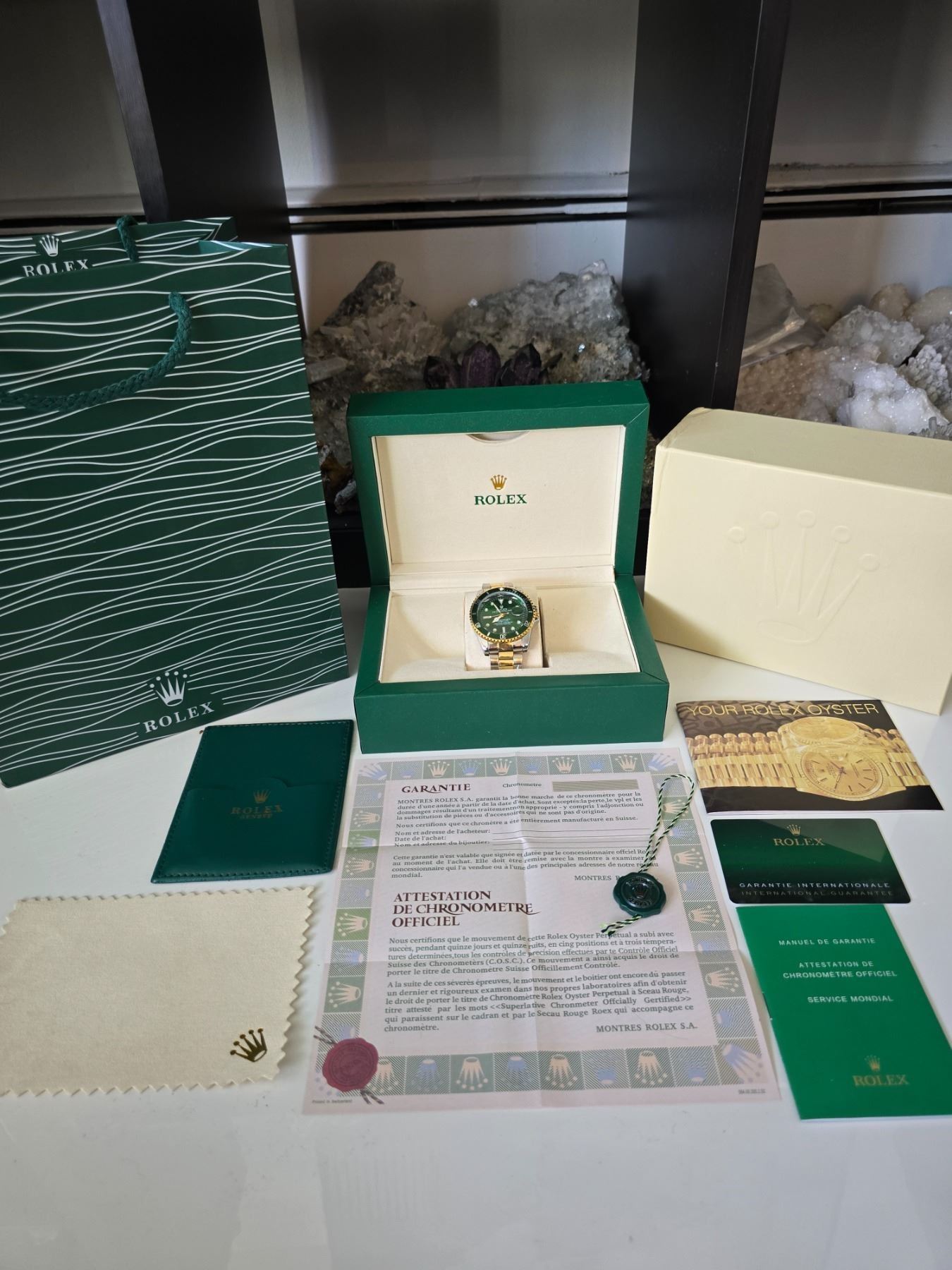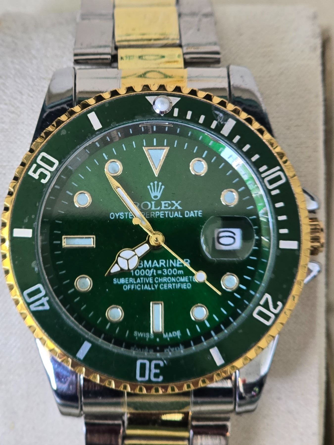ROLEX SUBMARINER 116610 LV "HULK" REPLICA WATCH. 2 TONE GOLD AND STAINLESS-STEEL CASE AND OYSTER BRACELET. GREEN DIAL AND GREEN/GOLD BEZEL. FULL SET WITH CASE, PAPERS AND BAG