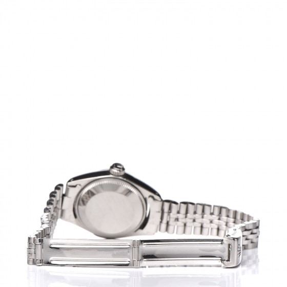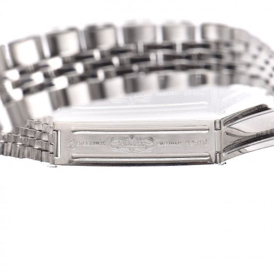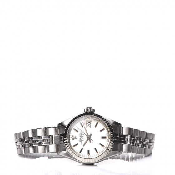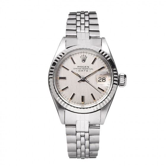 Description: ROLEX Stainless Steel 18K White Gold 26mm Oyster Perpetual Date Watch Silver 6917. Perpetual Date Watch Silver 6917. This classic watch is crafted of stainless steel with a jubilee bracelet, 18 karat white gold fluted bezel, and a silver dial with a date display