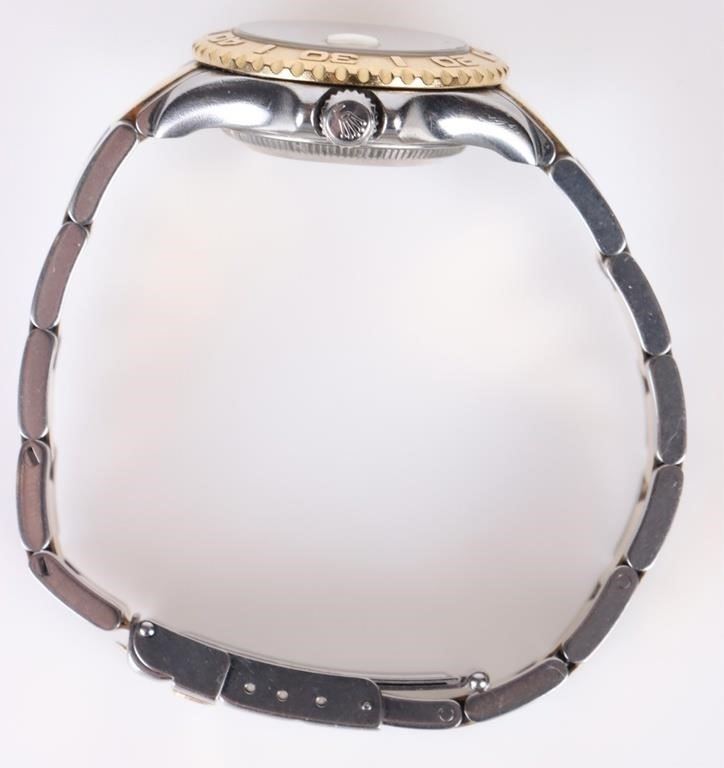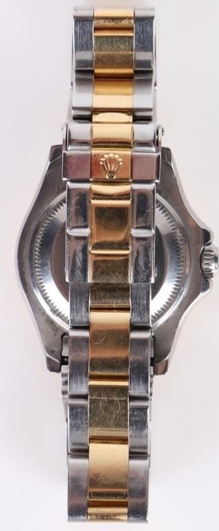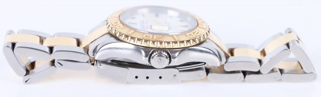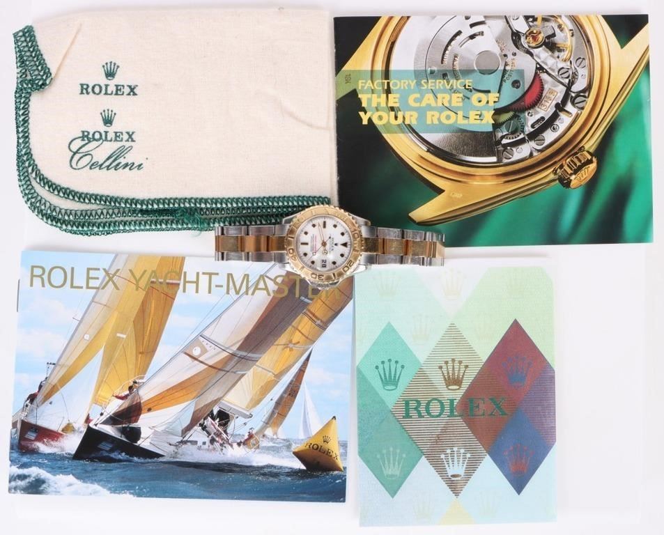 Rolex Yacht-Master two tone 18K yellow gold steel ladies wristwatch to include a graduated rotatable bezel, a oyster perpetual automatic movement, a tough synthetic sapphire crystal, a white dial, and more along with proper papers for the wristwatch.
