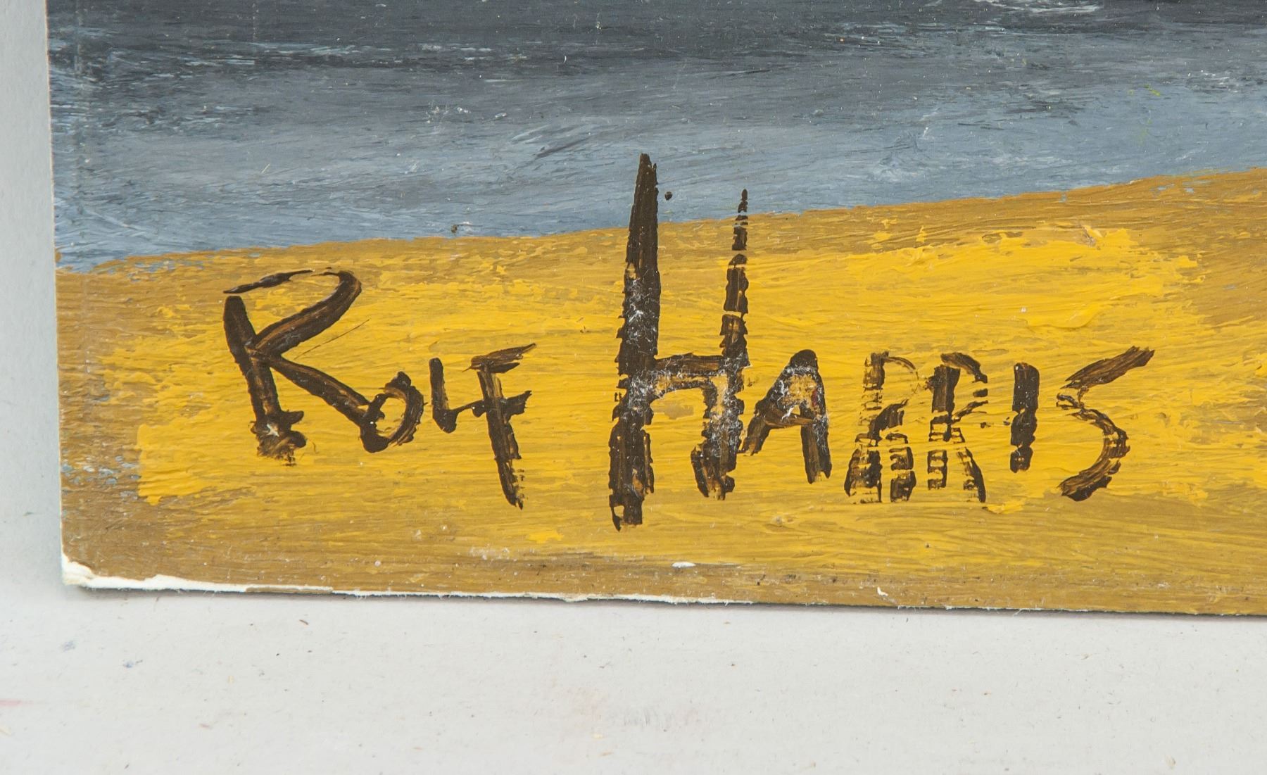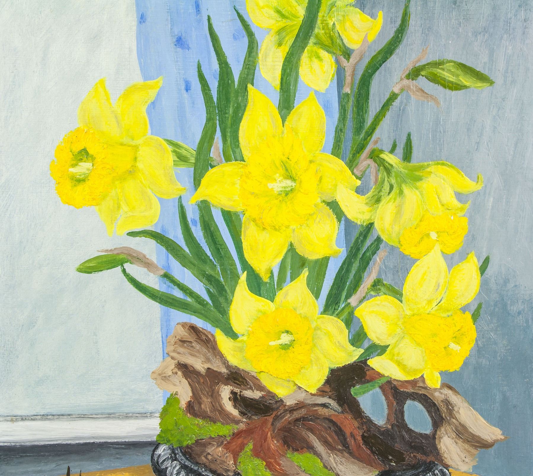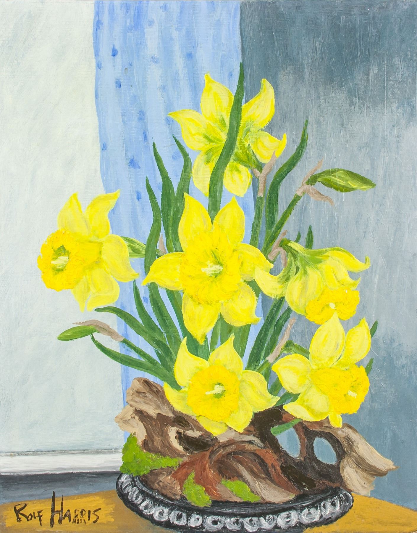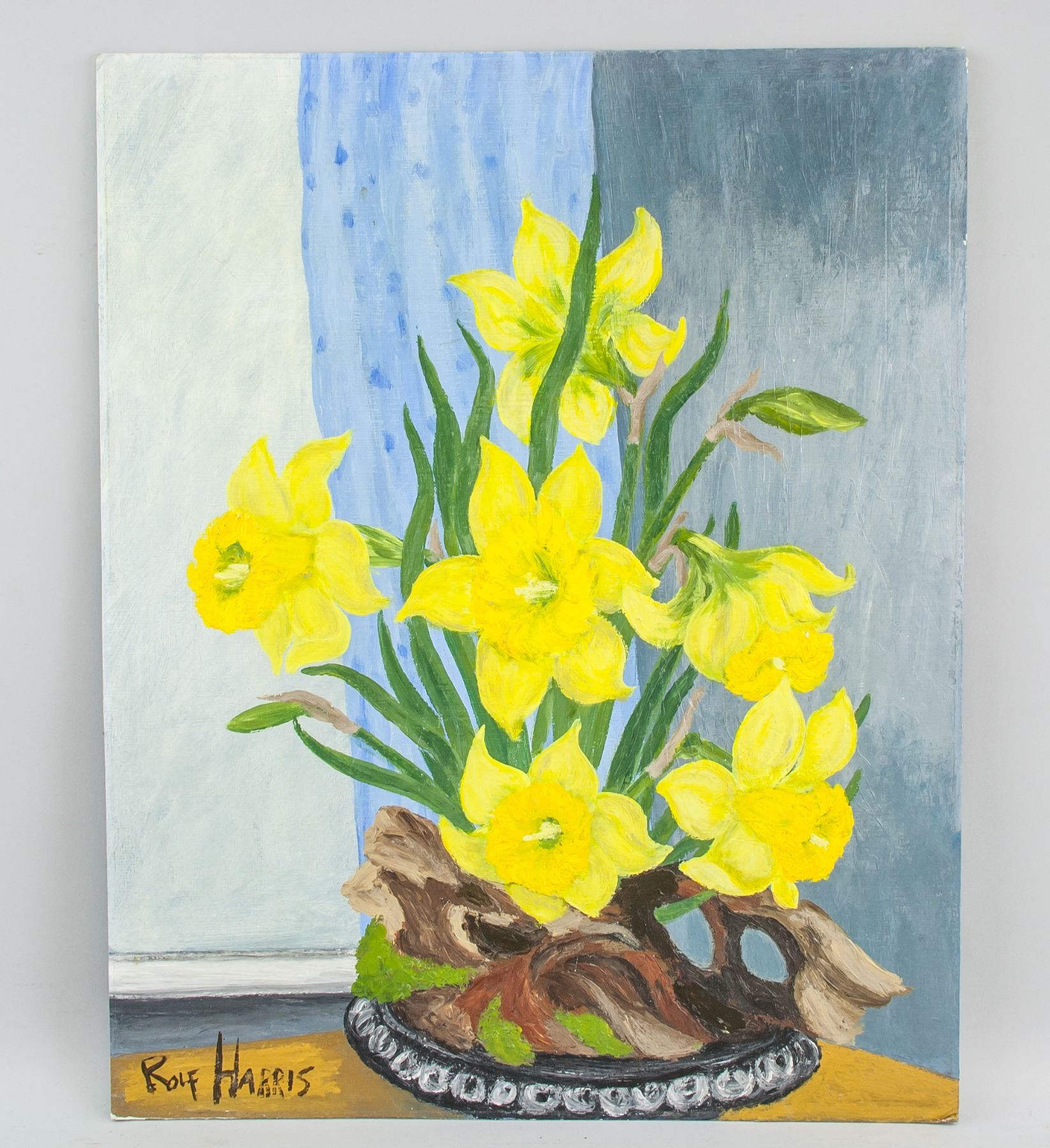 Oil on board. Featuring a still life painting of yellow narcissus flower. Signed and attr. Rolf Harris (Australia, b.1930). Signature on the lower left corner. 19.7 x 15.9 in. (50 x 40.5 cm). Harris moved to England in 1952 and became an art student at City and Guilds of London Art School in South London, at the age of 22. In 1953 he found work in television, at the BBC, performing a regular ten-minute cartoon drawing section in a one-hour children's show called Jigsaw, with a puppet called "Fuzz", made and operated on the show by magician Robert Harbin. He went on to illustrate Harbin's Paper Magic programme in 1956. In 1954, Harris was a regular on a BBC Television programme Whirligig, which featured a character called "Willoughby", who sprang to life on a drawing board, but was erased at the end of each episode. PROVENANCE: Private Collection (Manchester, UK)