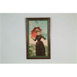 Lot # 617 ROLL DOWN LITHO SIGN FOR STAR SOAP. This attractive sign depicts a Victorian beauty with a parasol at the beach. The metal bands are present at both top and bottom. Dated 1887 and printed by Donaldson Bros. New York. SIZE: Overall is 19-3/4" x 33-1/2". CONDITION: Generally excellent. 1-29627 (700-1,000)