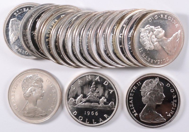 ROLL OF ( 20 ) 1966 CANADIAN SILVER DOLLARS, ALL GEM BU+