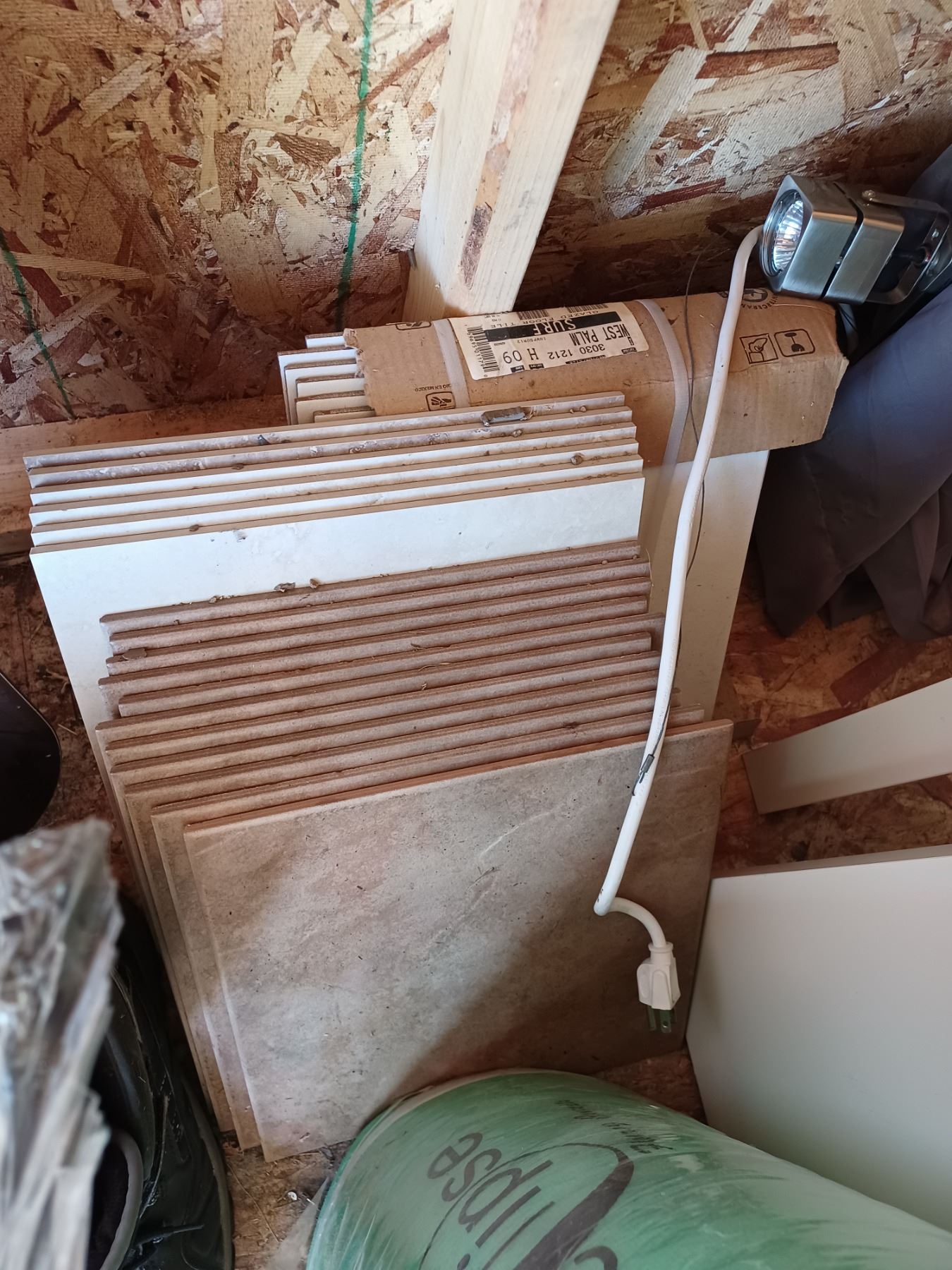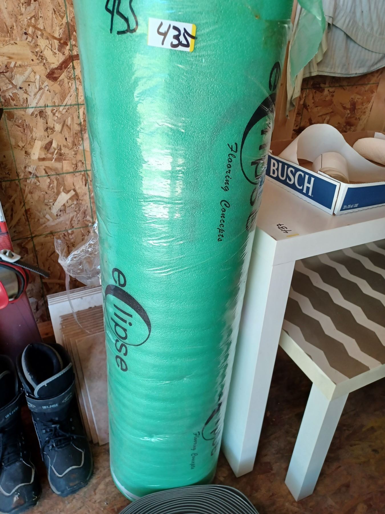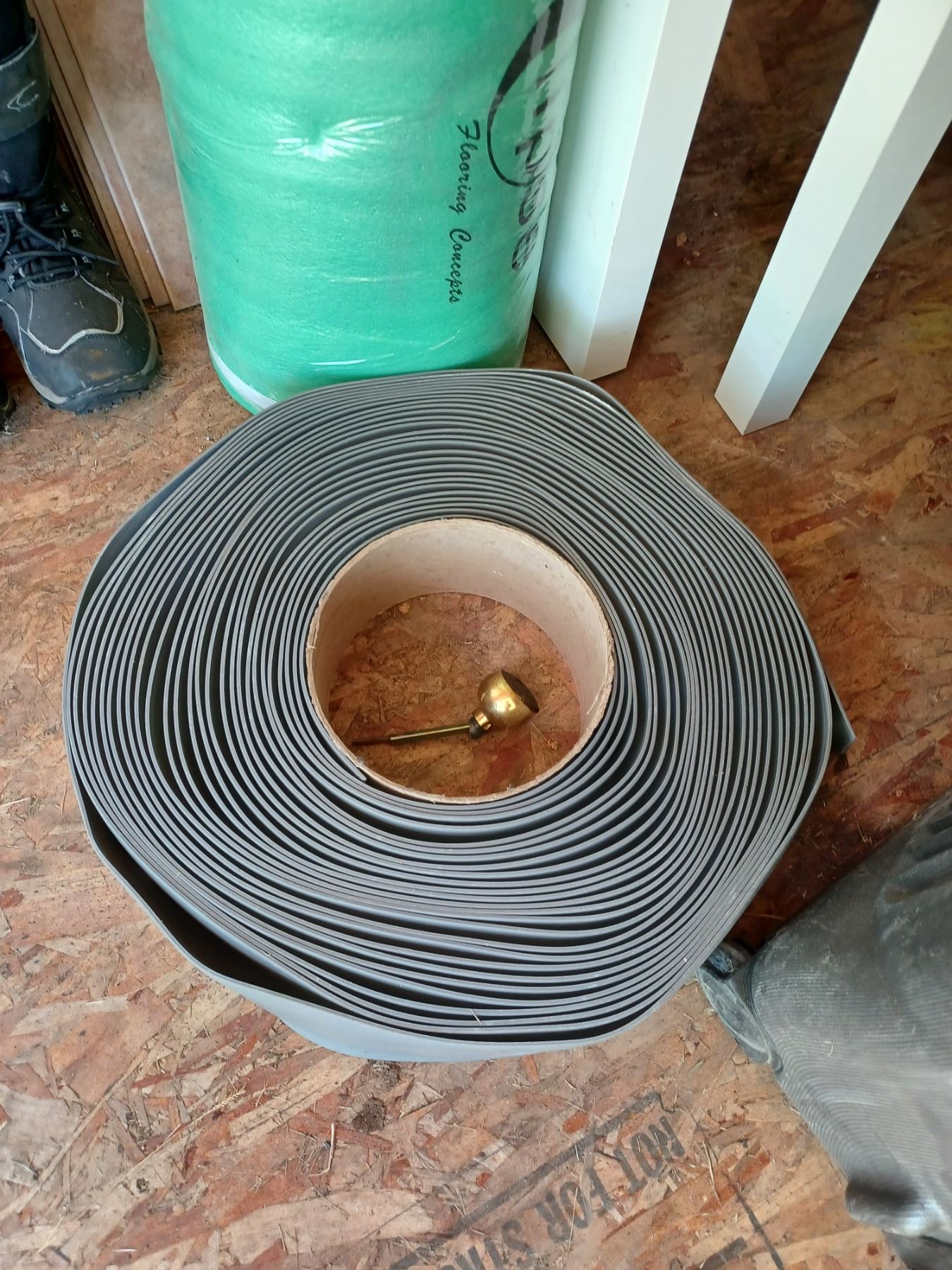ROLL OF 4" RUBBER TRIM; ROLL OF FOAM UNDERLAY & ASSORTED TILE (APPROX. 3 BOXES)
