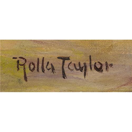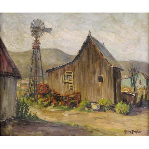 <B>ROLLA TAYLOR (1871-1970)</B></I><BR><I>House and Windmill</B></I><BR>Oil on canvas<BR>20in. x 24in.<BR>Signed lower right<BR>Signed and titled verso<BR><BR>A fabulous painting of an early settler cabin and windmill. Rolla Taylor enjoyed roaming the countryside and finding old buildings. His paintings of buildings and scenes of Texas history won him honors from the Texas State Historical and Landmark Association.<BR><BR>The painting is in one of Rolla Taylor's hand-carved frames.<BR><BR>Provenance:<BR>Rolla Taylor<BR>Clara Lee Sharp (Rolla Taylor's girlfriend)<BR>By descent to Haynie Conn<BR>By descent to Sharon Conn<BR><BR><BR><BR><b>Shipping:</b> Requires 3rd Party Shipping (<a target="_blank" href="http://www.heritageauctions.com/common/shipping.php">view shipping information</a>)