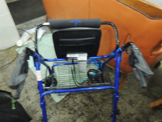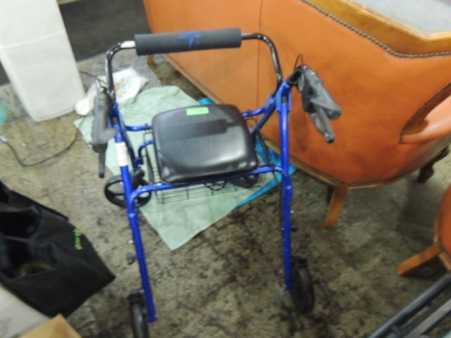 VERY LIGHTLY USED FOUR WHEEL ROLLING WALKER CART WITH BRAKES, FLIP UP SEAT, BASKET, BACKREST, ETC. LIKE NEW CONDITION, AS SHOWN.