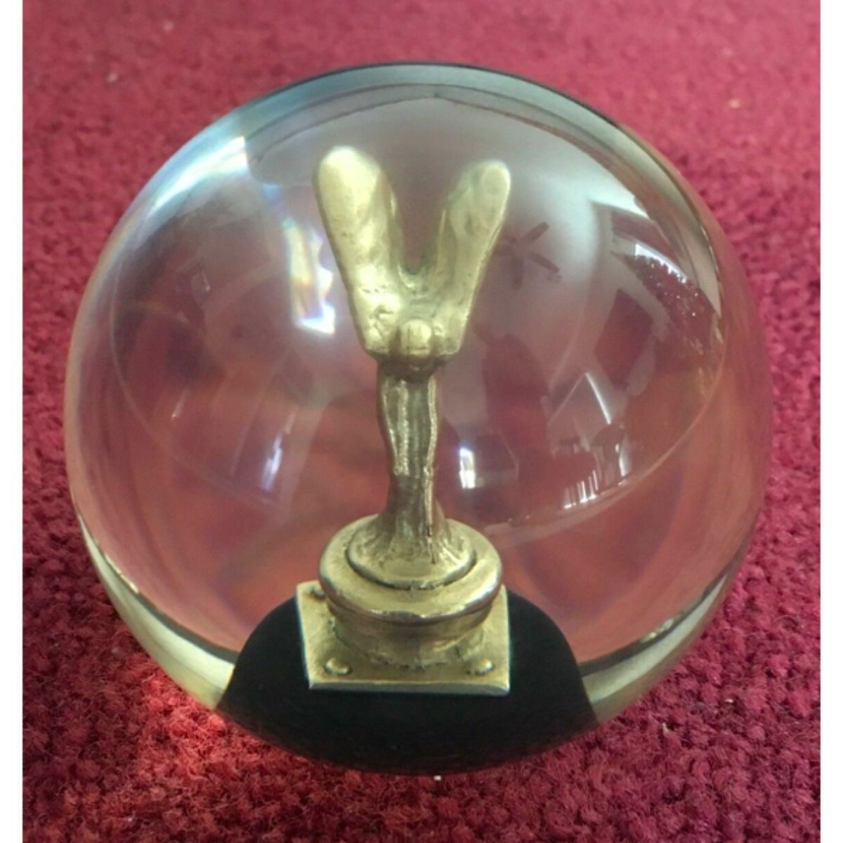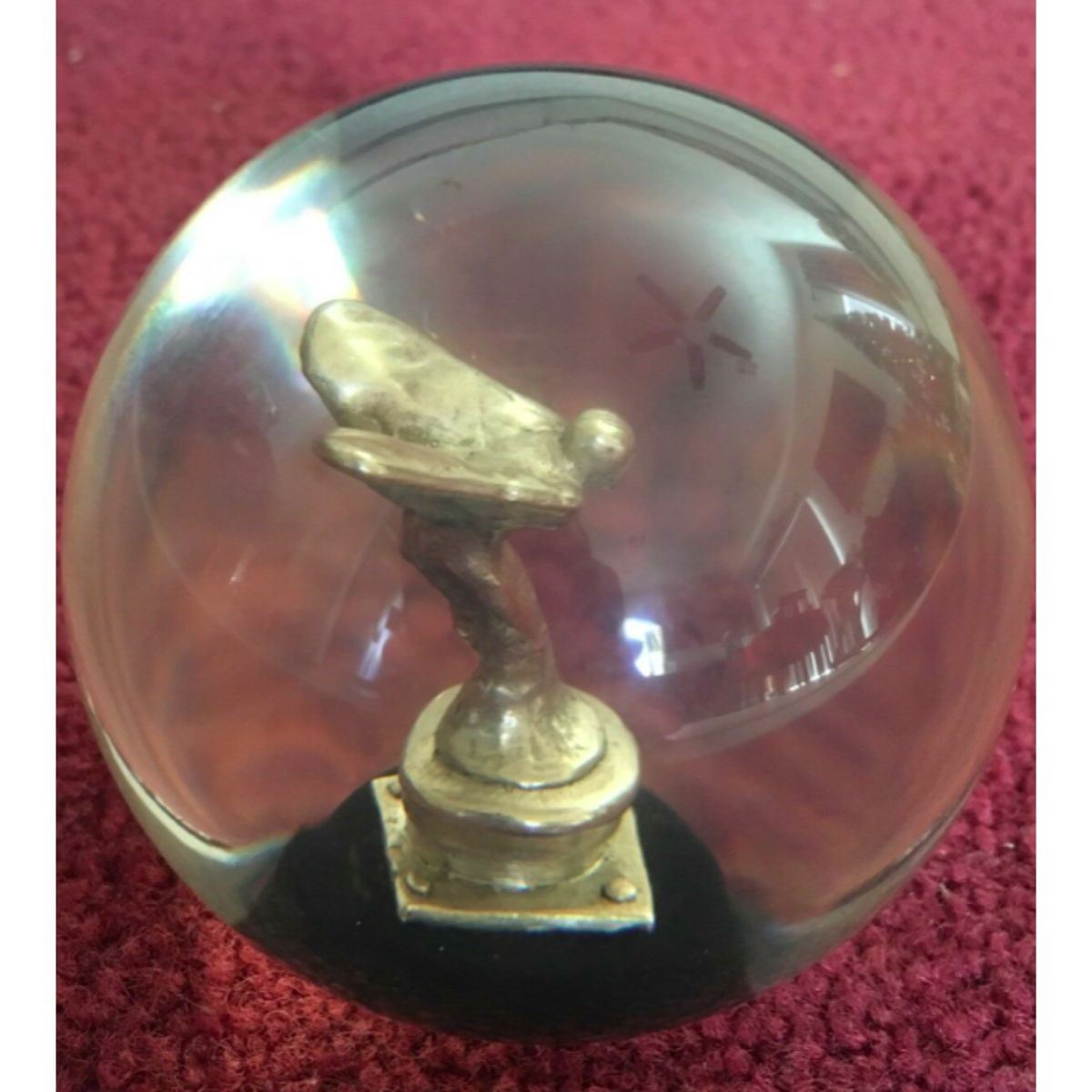 Solid clear plastic resin globe with the Rolls Royce Flying Lady mascot inside. Measures approximately 2 1/2" with felt lining the underneath.
