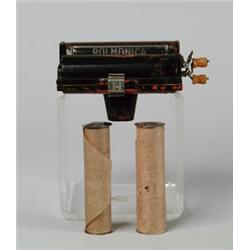 Lot # 670 ROLMONICA ROLL PLAYING MOUTH ORGAN. Ca. 1928 with 8 rolls in good condition. Hand crank and blow. SIZE: 5" l x 4" h x 2-3/4" d. CONDITION: Very good. 1-29412 (100-200)