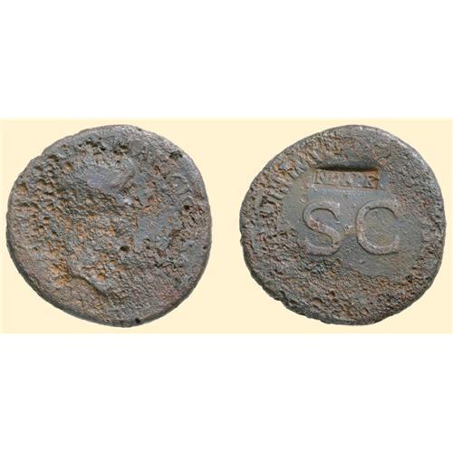 AE Sestertius (25.49 g). 50-54 AD, struck under Claudius. AGREIPPINA M F GERMANICI CAESARIS, draped bust of Agrippina right / TI CLAVDIVS CAESAR AVC GERM TR P IMP P P around SC. C. 1; RIC 102. Countermarked with "N C APR."