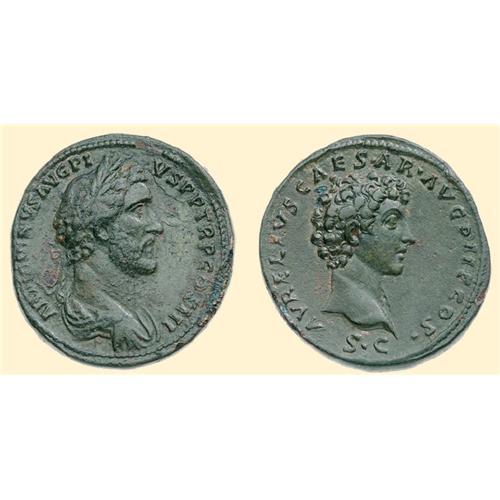 AE Sestertius (26.04 g) 140-144 AD. ANTONINVS AVG PI-VS P P TR P COS III, laureate and draped bust of Antoninus Pius right / AVRELIVS CAESA AVG PII F COS / SC , head of Marcus Aurelius right. C. 30; RIC 172, 1218.
