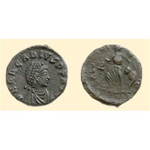 AE 11 (1.48 g) Constantinople, 388-392 AD. D N ARCADIVS P F AVG, draped and diademed bust of Arcadius right / SALVS REI-PVBLICAE / CONSG, Victory left, dragging a prisoner; Christogram in field. RIC 86 c.