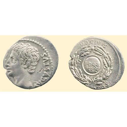 Denarius (3.58 g). Spanish mint (perhaps Colonia Patricia), c. 19 B.C. … AVGVSTVS, bare head of Augustus levt / OB CIVIS SERVATOS around oak wreath containing shield inscribed SPQR CL V. RIC 79b. BMCRE 383. Foss 28. A historical issue commemorating the senate`s awarding of the title Augustus and various other honors, including the oak wreath and the clupeus virtutis that are depicted on this coin.