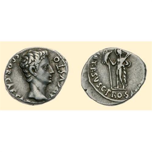 AR Denarius (3.86 g). Spain, 19/8-17/6 BC. SPQR CAESARI AVGVSTO, head of Augustus right / VOT P SVSC PRO SAL [ET RED I O M SACR], Mars, facing, with standard and parazonium. RIC 150a or 152.