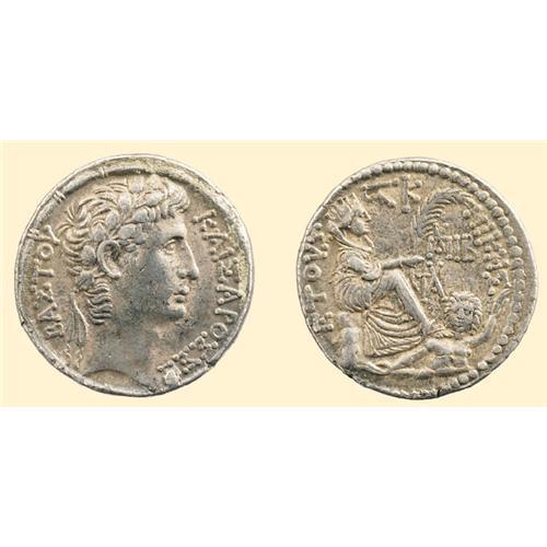 27 B.C.-A.D. 14. AR Tetradrachm (15.21 g), 5 BC. laureate head of Augustus right / Tyche of Antioch seated right, holding branch, the river-god Orontes at her feet; date (year 26) and consulship indication (12) in fields. RPC I, 4151. Prieur 50.