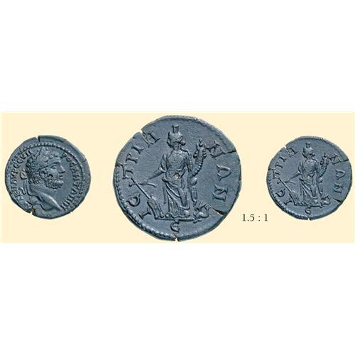 Caracalla, 198-217 AD. 5 Assaria (16.80 g). <SPAN STYLE=`FONT-SIZE:10.0PT;FONT-FAMILY:SYMBOL;COLOR:#333333`>AUT K M AUR </SPAN>C<SPAN STYLE=`FONT-SIZE:10.0PT;FONT-FAMILY:SYMBOL;COLOR:#333333`>EUH-RO</SPAN>C<span style=`font-size:10.0pt;font-family:Symbol;color:#333333`> ANTWNIN-O</span>C, laureate bust of Caracalla right / <SPAN STYLE=`FONT-SIZE:10.0PT;FONT-FAMILY:SYMBOL;COLOR:#333333`>IC-TRIH-NWN / E</SPAN>, Tyche left, with cornucopia and rudder. AMNG I/1, 505; BMC -.