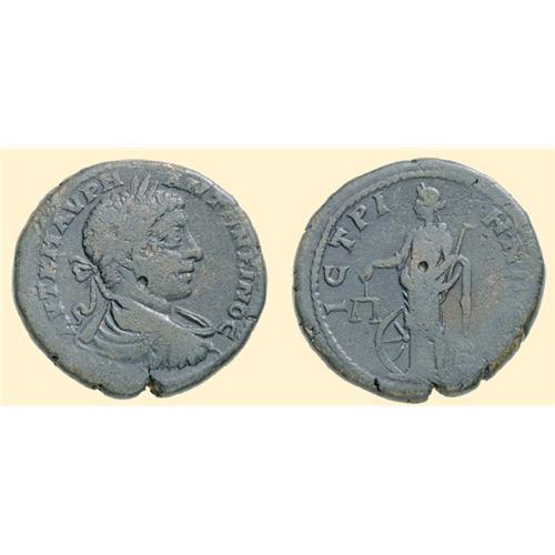 Elagabalus, 218-222 AD. 5 Assaria (16.15 g). <SPAN STYLE=`FONT-SIZE:10.0PT;FONT-FAMILY:SYMBOL;COLOR:#333333`>AUT K M AURH - ANTWNEINO</SPAN>C, laureate, draped and cuirassed bust of Elagabalus right / <SPAN STYLE=`FONT-SIZE:10.0PT;FONT-FAMILY:SYMBOL;COLOR:#333333`>ICTRI-HNWN / E</SPAN>, Nemesis left, with scales and wheel. AMNG I/1, - ; BMC -.
