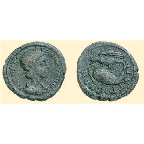 Tranquillina, wife of Gordian III, 241 AD. 3 Assaria (8.19 g). C<SPAN STYLE=`FONT-SIZE:10.0PT;FONT-FAMILY:SYMBOL;COLOR:#333333`>ABINA-TRANKULINA</SPAN>, diademed and draped bust of Tranquillina right / <SPAN STYLE=`FONT-SIZE:10.0PT;FONT-FAMILY:SYMBOL;COLOR:#333333`>ICTRIHNWN</SPAN>, eagle on dolphin left. AMNG I/1, 529; BMC - ; SNG Stancomb -.