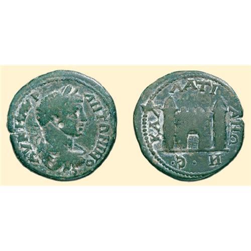 Caracalla, 198-217 AD. 5 Assaria (10.11 g). <SPAN STYLE=`FONT-SIZE:10.0PT;FONT-FAMILY:SYMBOL;COLOR:#333333`>AU K M AUR - ANTWNINO-</SPAN>C, laureate and draped bust of Caracalla right / <SPAN STYLE=`FONT-SIZE:10.0PT;FONT-FAMILY:SYMBOL;COLOR:#333333`>KAL-LATI-ANW-N</SPAN> / <SPAN STYLE=`FONT-SIZE:10.0PT;FONT-FAMILY:SYMBOL;COLOR:#333333`>E</SPAN>, city gate of Kallatis. AMNG I/1, 321; BMC -.