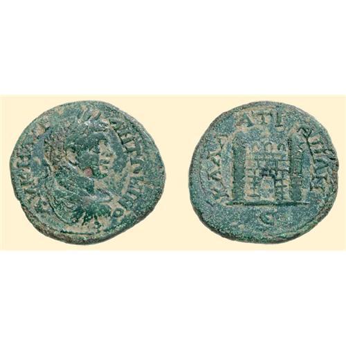 5 Assaria (10.95 g). <SPAN STYLE=`FONT-SIZE:10.0PT;FONT-FAMILY:SYMBOL;COLOR:#333333`>U K M AUR - ANTWNINO-</SPAN>C, laureate and draped bust of Caracalla right / <SPAN STYLE=`FONT-SIZE:10.0PT;FONT-FAMILY:SYMBOL;COLOR:#333333`>KALL-ATI-ANWN / E</SPAN>, city gate of Kallatis. AMNG I/1, 321,1; BMC -.