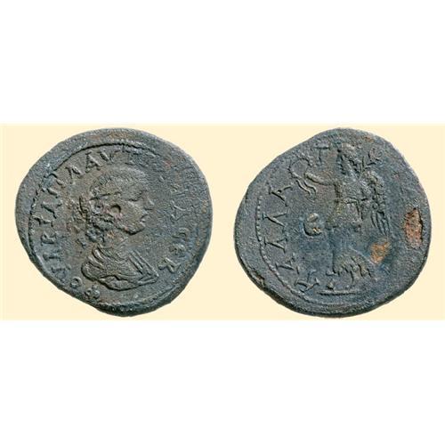 Plautilla, wife of Caracalla, 202-205 AD. 5 Assaria (11.68 g). FOULBIA PLAUTILLA CEB, draped bust of Plautilla right / KALLA-T-IANWN, Victory left, with palm and wreath. AMNG I/1, - ; BMC -.