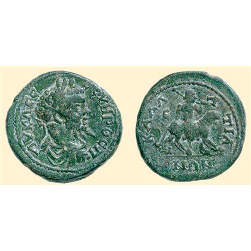 Septimius Severus, 193-211 AD. 5 Assaria (14.33 g). <SPAN STYLE=`FONT-SIZE:10.0PT;FONT-FAMILY:SYMBOL;COLOR:#333333`>AU K L </SPAN>C<SPAN STYLE=`FONT-SIZE:10.0PT;FONT-FAMILY:SYMBOL;COLOR:#333333`>E - </SPAN>C<SPAN STYLE=`FONT-SIZE:10.0PT;FONT-FAMILY:SYMBOL;COLOR:#333333`>EUHRO</SPAN>C<span style=`font-size:10.0pt;font-family:Symbol;color:#333333`> P</span>, laureate, draped and cuirassed bust of Septimius Severus right / <SPAN STYLE=`FONT-SIZE:10.0PT;FONT-FAMILY:SYMBOL;COLOR:#333333`>KALL-A-TIA-NWN</SPAN>, Dionysos on a lion right. AMNG I/1, 304; BMC -.