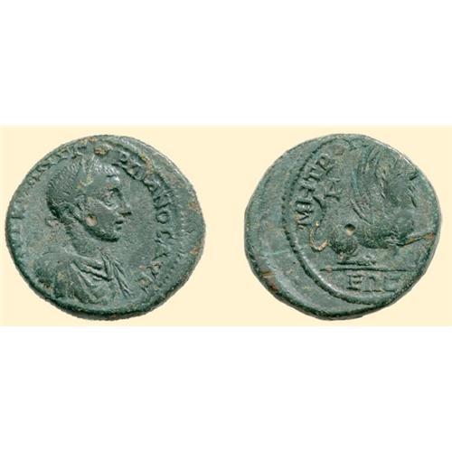 4 Assaria (10.69 g). <SPAN STYLE=`FONT-SIZE:10.0PT;FONT-FAMILY:SYMBOL;COLOR:#333333`>AUT K M ANT GORDIANO</SPAN>C<span style=`font-size:10.0pt;font-family:Symbol;color:#333333`> AUG</span>, laureate draped and cuirassed bust of Gordian III right / <SPAN STYLE=`FONT-SIZE:10.0PT;FONT-FAMILY:SYMBOL;COLOR:#333333`>MHTRO PON-[TOU TOM]EW</SPAN>C<span style=`font-size:10.0pt;font-family:Symbol;color:#333333`> / D</span>, winged gryphon right, placing his paw on a wheel. AMNG I/2, 3498; BMC -.