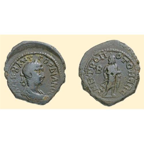 2 Assaria (5.60 g). <SPAN STYLE=`FONT-SIZE:10.0PT;FONT-FAMILY:SYMBOL;COLOR:#333333`>AUT K M ANT - GORDIANO</SPAN>C, laureate draped bust of Gordian III right / <SPAN STYLE=`FONT-SIZE:10.0PT;FONT-FAMILY:SYMBOL;COLOR:#333333`>MHTRO P-O TOMEW</SPAN>C<span style=`font-size:10.0pt;font-family:Symbol;color:#333333`> / B</span>, Asklepios left, a serpent wrapped around his staff. AMNG I/2, 3506; BMC -.