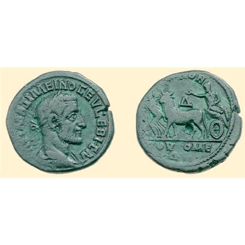 Maximinus I, 235-238 AD. 4 Assaria (11.94 g). <SPAN STYLE=`FONT-SIZE:10.0PT;FONT-FAMILY:SYMBOL;COLOR:#333333`>AUT MAXIMEINO</SPAN>C<span style=`font-size:10.0pt;font-family:Symbol;color:#333333`> EU</span>C<SPAN STYLE=`FONT-SIZE:10.0PT;FONT-FAMILY:SYMBOL;COLOR:#333333`>EBH</SPAN>C<span style=`font-size:10.0pt;font-family:Symbol;color:#333333`> AUG</span>, laureate draped and cuirassed bust of Maximinus I right / <SPAN STYLE=`FONT-SIZE:10.0PT;FONT-FAMILY:SYMBOL;COLOR:#333333`>MHTROP PON/TOU TOME/W</SPAN>C<span style=`font-size:10.0pt;font-family:Symbol;color:#333333`> / D</span>, two wheeled chariot pulled by bulls, driven by a woman, with a man standing and another one seated towards the rear. AMNG I/2, 3326; BMC 60, 46; SNG Stancomb -.