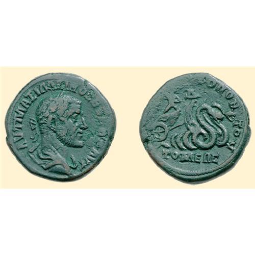 4 Assaria (12.08 g). <SPAN STYLE=`FONT-SIZE:10.0PT;FONT-FAMILY:SYMBOL;COLOR:#333333`>AUT MAXIMEINO</SPAN>C<span style=`font-size:10.0pt;font-family:Symbol;color:#333333`> EU</span>C<SPAN STYLE=`FONT-SIZE:10.0PT;FONT-FAMILY:SYMBOL;COLOR:#333333`>EBH</SPAN>C<span style=`font-size:10.0pt;font-family:Symbol;color:#333333`> AUG</span>, laureate draped and cuirassed bust of Maximinus I right / <SPAN STYLE=`FONT-SIZE:10.0PT;FONT-FAMILY:SYMBOL;COLOR:#333333`>MHTRO PON-TOU / TOME/W</SPAN>C<span style=`font-size:10.0pt;font-family:Symbol;color:#333333`> / D</span>, Triptolemos riding in a chariot pulled by two serpents. AMNG I/2, 3308 var.