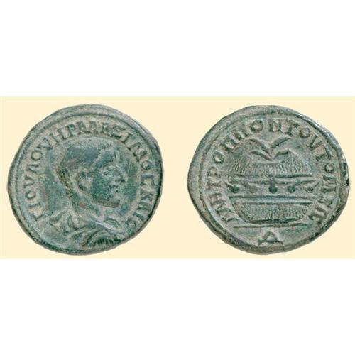 Maximus, 235-238 AD. 4 Assaria (13.09 g). <SPAN STYLE=`FONT-SIZE:10.0PT;FONT-FAMILY:SYMBOL;COLOR:#333333`>G IOUL OUHR MAXIMO</SPAN>C<span style=`font-size:10.0pt;font-family:Symbol;color:#333333`> KAI</span>C, draped cuirassed bust of Maximus right / <SPAN STYLE=`FONT-SIZE:10.0PT;FONT-FAMILY:SYMBOL;COLOR:#333333`>MHTROP PONTOU TOMEW</SPAN>C<span style=`font-size:10.0pt;font-family:Symbol;color:#333333`> / D</span>, agonistic crown with two blades of wheat. AMNG I/2, 3356; BMC -.