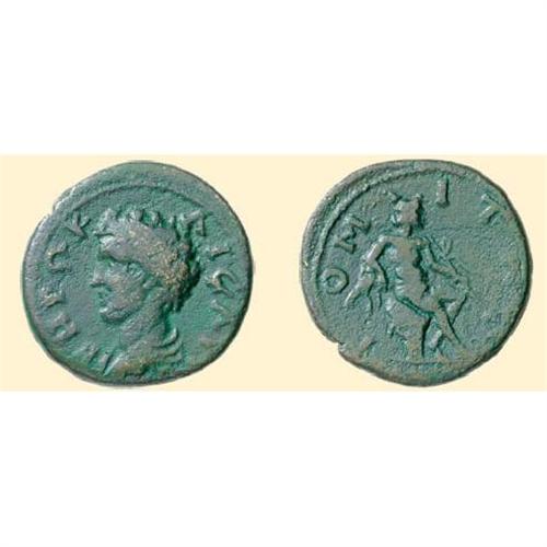 AE 18 (3.36 g). NHRW K-AICAR, draped bust of Nero right / T-OM-IT[WN], Pan seated right on rock, with panther`s skin and thyrsos. AMNG I/2, - ; RPC I, -.