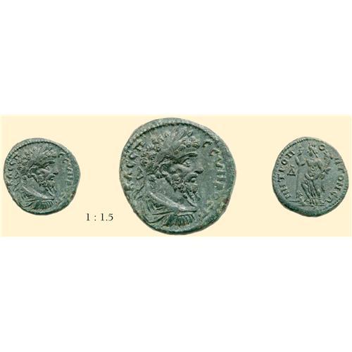 Septimius Severus, 193-211 AD. 4 Assaria (11.21 g). <SPAN STYLE=`FONT-SIZE:10.0PT;FONT-FAMILY:SYMBOL;COLOR:#333333`>AU K L </SPAN>C<SPAN STYLE=`FONT-SIZE:10.0PT;FONT-FAMILY:SYMBOL;COLOR:#333333`>EP - </SPAN>C<SPAN STYLE=`FONT-SIZE:10.0PT;FONT-FAMILY:SYMBOL;COLOR:#333333`>EUHRO</SPAN>C<span style=`font-size:10.0pt;font-family:Symbol;color:#333333`> </span>P, laureate draped and cuirassed bust of Septimius Severus right / <SPAN STYLE=`FONT-SIZE:10.0PT;FONT-FAMILY:SYMBOL;COLOR:#333333`>MHTRO P-O-N TOMEW</SPAN>C<span style=`font-size:10.0pt;font-family:Symbol;color:#333333`> / D</span>, Tyche left, with mural crown, river god Istros at her feet. AMNG I/2, 2761; BMC - ; SNG Stancomb -.