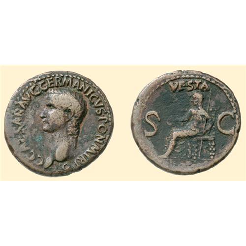 AE As (11.74 g) 37-38 AD. C CAESAR AVG GERMANICVS PON M TP P, head left / VESTA / S-C, Vesta enthroned left. C. 27; RIC 38.