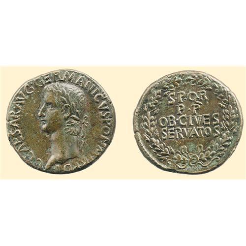 AE Sestertius (29.01 g). 37-38 AD. Laureate head of Caligula left / S P Q R P P OB CIVES SERVATOS in four lines within oak wreath. RIC 37; BMC 38.