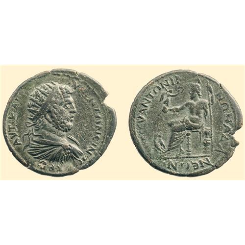 AE 38 Medallion (25.11 g). Adana, Cilicia. <SPAN STYLE=`FONT-SIZE:10.0PT;FONT-FAMILY:SYMBOL;COLOR:#333333`>AUT KAI[...U...A]NTW NEINOS</SPAN>, radiate draped bust of Caracalla right / <SPAN STYLE=`FONT-SIZE:10.0PT;FONT-FAMILY:SYMBOL;COLOR:#333333`>ADA-NEWN </SPAN>…<SPAN STYLE=`FONT-SIZE:10.0PT;FONT-FAMILY:SYMBOL;COLOR:#333333`>U ANTWNII-A-NWN</SPAN>, Zeus enthroned left, holding Victory and scepter, eagle at his feet. SNG France - ; SNG Switzerland 1 - ; SNG Levante, Adana, NC 1984, -, possibly unpublished. For the same reverse type on a medallion of Gordian III from Heraklea Pontica, see Waddington 205. A magnificent portrait of Caracalla.