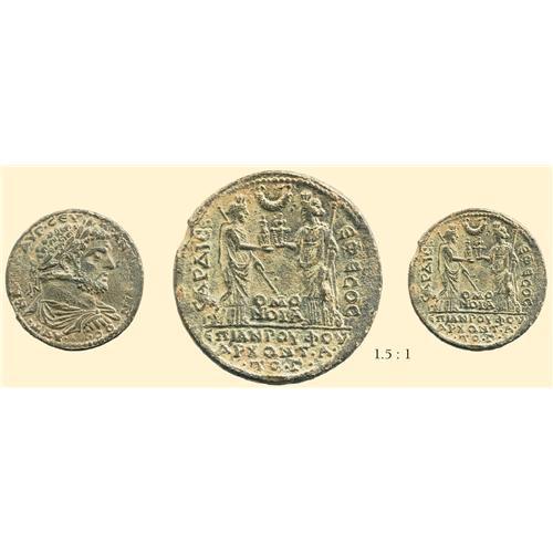 AE 35 Medallion (20.09 g). Alliance Issue of Sardes and Ephesos. <SPAN STYLE=`FONT-SIZE:10.0PT;FONT-FAMILY:SYMBOL;COLOR:#333333`>AUT KAI M AUR SEU-H ANT[WNEI]N-OS</SPAN>, laureate, draped and cuirassed bust of Caracalla right / <SPAN STYLE=`FONT-SIZE:10.0PT;FONT-FAMILY:SYMBOL;COLOR:#333333`>SARDIS - EFESOS - OMONOIA, EPI ANROUFOU / ARCONT A / TO G</SPAN>, Tyche (city goddess) of Sardes at left, holding cult statue of Kore and scepter, facing Tyche of Ephesos at right, holding cult statue of the Artemis from Ephesos and scepter, wreath above. SNG von Aulock 8258. A coin with outstanding detail throughout, including the small cult statuettes held by the two Tychai.