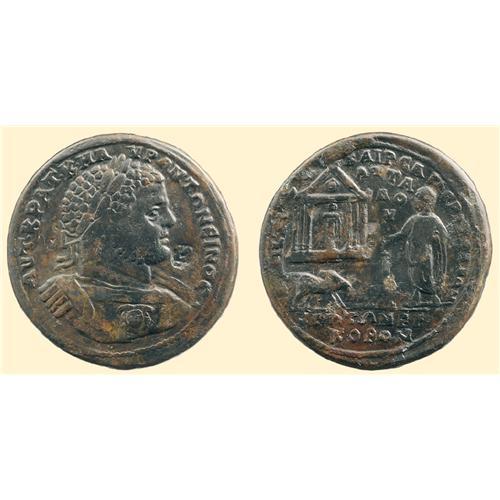 AE 45 Medallion (51.86 g). Pergamon, Mysia. <SPAN STYLE=`FONT-SIZE:10.0PT;FONT-FAMILY:SYMBOL;COLOR:#333333`>AUT. KRAT. K. MA-UR ANTWNEINOS</SPAN>, laureate cuirassed bust of Caracalla right, with prominent gorgoneion / <span style=`font-size:10.0pt;font-family:Symbol;color:#333333`>[EP]I </span>C<SPAN STYLE=`FONT-SIZE:10.0PT;FONT-FAMILY:SYMBOL;COLOR:#333333`>TR [M] - KAIREL /ATTALO/U / PER[GAMEI]WN / PRWTWN G NEW/KORWN</SPAN>, Caracalla in toga standing left, holding patera and roll, facing hexastyle temple with statue of Asklepios inside; small figure in front, humped bull to left. H. v. Fritze, Nomisma II, 1908, pl. III, 16; BMC -, cf 155, 324; Moushmov pl. XVII,4 var. (Perinthos); SNG v. Aulock -. A remarkable medallion with fine architectural type, extremely large, circular countermark on reverse.