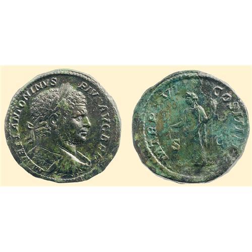 AE Sestertius (28.93 g.). M AVREL ANTONINVS PIVS AVG BRIT, laureate, draped and cuirassed bust of Caracalla right / PM TRP XVI COS IIII, PP / S - C, goddess standing left, holding scepter and bag.