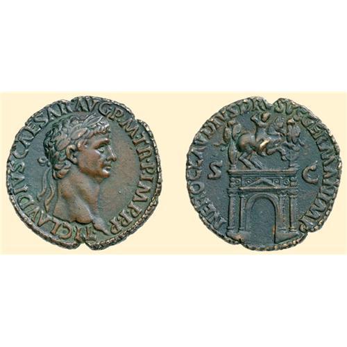 AE Sestertius (18.09 g). 41-50 AD. TI CLAVDIVS CAESAR AVG P M TR IMP P P, laureate head of Claudius left / NERO CLAVDIVS DRVSVS GERMAN IMP / S-C, equestrian statue on a triumphal arch. C. 48; RIC 98.