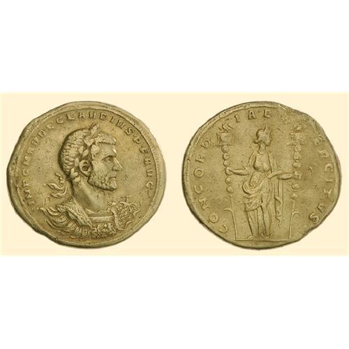 Large Gold 8 Aurei Medallion (38.11 g.). September 268 AD. IMP C M AVRL CLAVDIVS P F AVG, laureate and cuirassed bust right, aegis on the left shoulder, the plastron of the cuirass decorated with the emperor on horseback right, aiming lance toward a Medusa head / CONCORD-IA EX-ERCITVS, Concordia facing, head right, holding a military standard in each hand. C. - ; RIC cf. 211, 1 ; J. Laufaurie, RN 1958, 710 (same dies); H. Huvelin & J. Lafaurie, RN 1980, 13-21. An extremely large and very rare gold medallion.