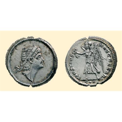Constans as Caesar. AR Siliqua (2.92 g) Constantinople, 337 AD. Diademed head right, gazing upward / CONSTANS - NOB CAESAR / C . I, Victory left, with palm branch and wreath. RIC 136.
