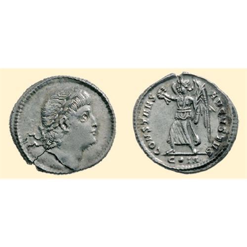 Constans as Augustus. AR Siliqua (2.82 g). Constantinople, 337-340 AD. Diademed head right, gazing upward / CONSTANS - AVGVSTVS / C . IA, Victory left, with palm branch and wreath. RIC 19/20 var.