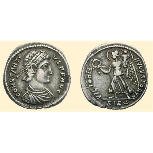 AR Siliqua (3.32 g). Siscia, 340-350 AD. CONSTANTI-VS P F AVG, diademed and draped bust of Constantius II right / VICTORIA - AVGVSTORVM / SIS, Victory left, with trophy and wreath. RIC 362, 169.