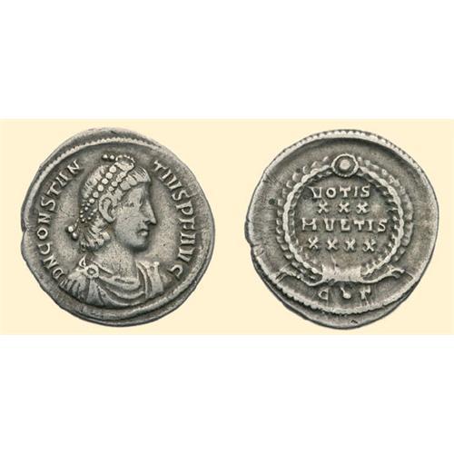 AR Siliqua (3.14 g). Constantinople, 351-355 AD. D N CONSTAN-TIVS AVG, diademed, draped and cuirassed bust of Constantius II right / VOTIS / XXX / MVLTIS / XXXX, all within wreath, C in exergue. RIC 456, 102.